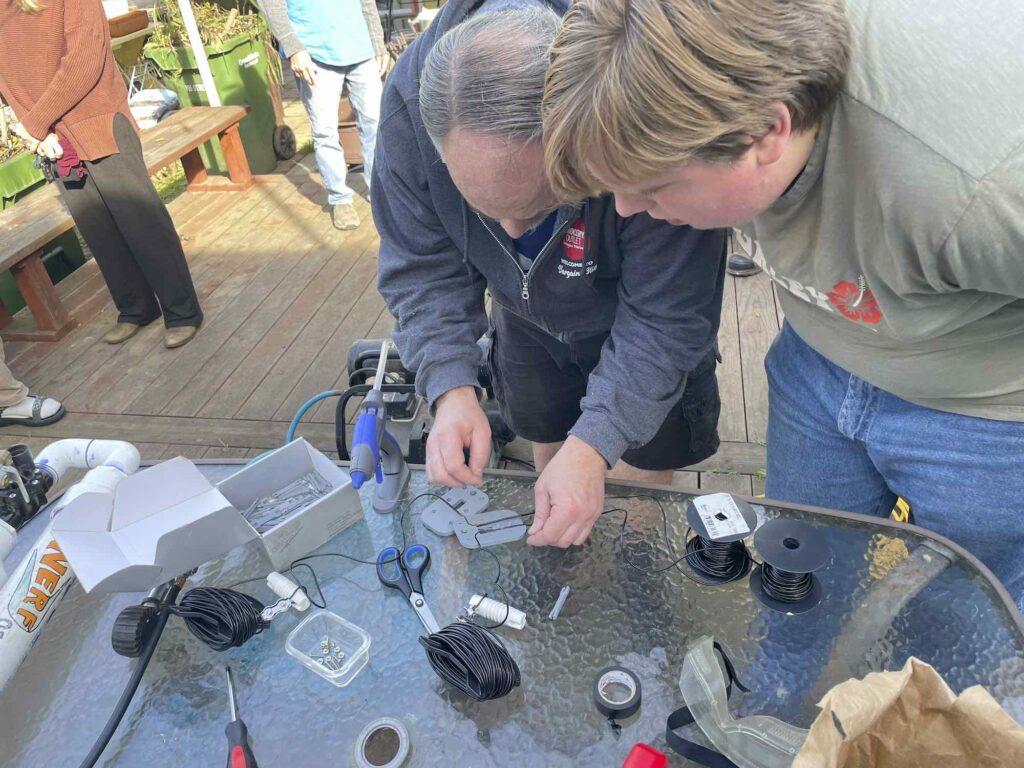 Kevin was all over the place up and down the ladder on roof many times and on fences helping with lines. Mike had excellent suggestions and Peter helped keep Keenan’s parents calm. Keenan and his father worked together on the center element that connects the ladder line portion of the antenna. Kevin and Paul installed the 60 3d printed pieces of the ladder line.